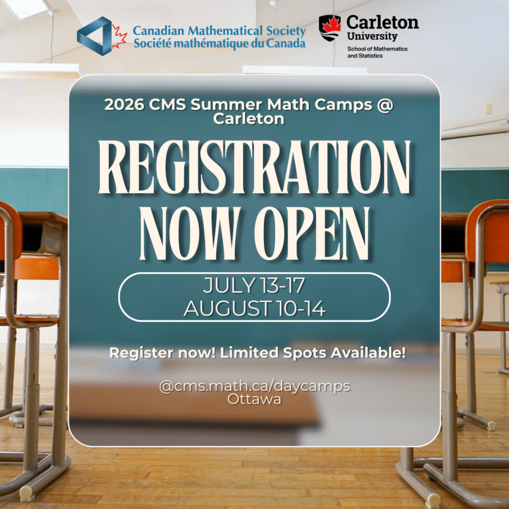 For the fourth year running, CMS, in partnership with Carleton University, Department of Mathematics and Statistics, is thrilled to announce the return of our popular Summer Math Camp in Ottawa! Open to all students, this year’s camp promises another exciting opportunity to explore the world of mathematics in a fun and engaging environment. We’re delighted to continue building this vibrant community of young mathematicians and look forward to welcoming new and returning campers.