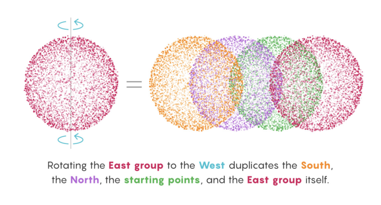 Figure 2. One visualization of the Banach-Tarski paradox. Artwork by Samuel Velasco for Max G. Levy, “Banach-Tarski and the Paradox of Infinite Cloning,” Quanta Magazine, 26 August 2021.