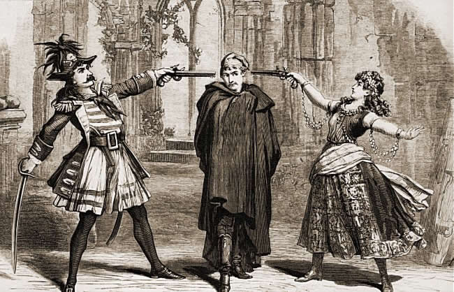 Figure 3. An 1880 drawing of the ‘paradox trio’ from Act II of The Pirates of Penzance, in which the Pirate King and Ruth hold Frederic at gunpoint while they explain the paradox engendered by his February 29 birthday. Commissioned by D’Oyly Carte Opera Company for the opera’s London premiere. Gilbert and Sullivan Archive.